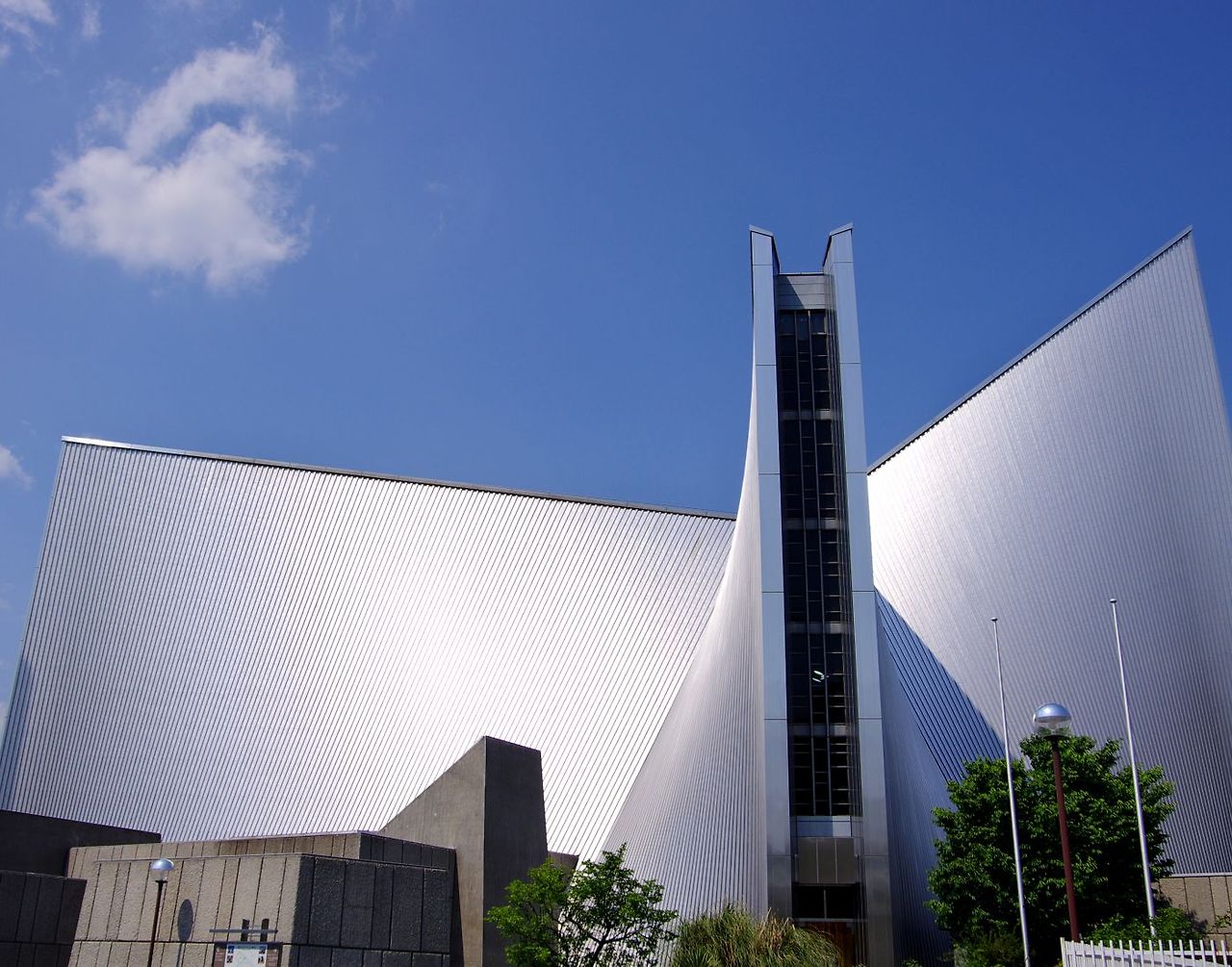 도쿄에 위치한 성모 마리아 대성당은 3차원 곡면이 강조된 역동적인 형태의 구조체를 보여줍니다.