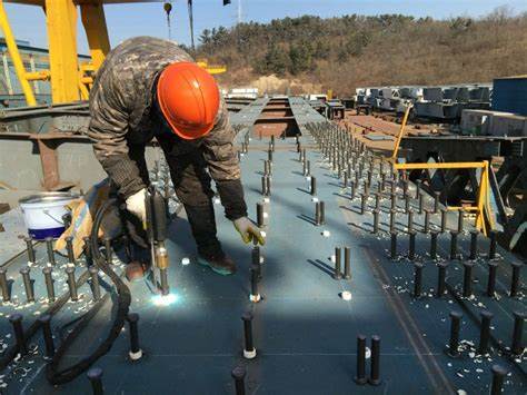 데크플레이트를 철골 보에 고정하기 위해 아크 용접 또는 모살용접을 사용합니다.