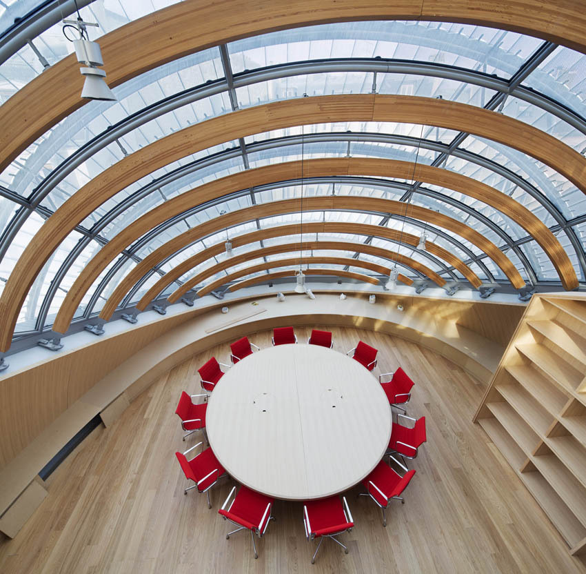 역사적인 건물들로 둘러싸인 블록의 중앙 마당에 자리잡고 있으며, 지붕의 주요 재료는 유리로, 재단의 사무 공간에 자연광을 제공합니다.