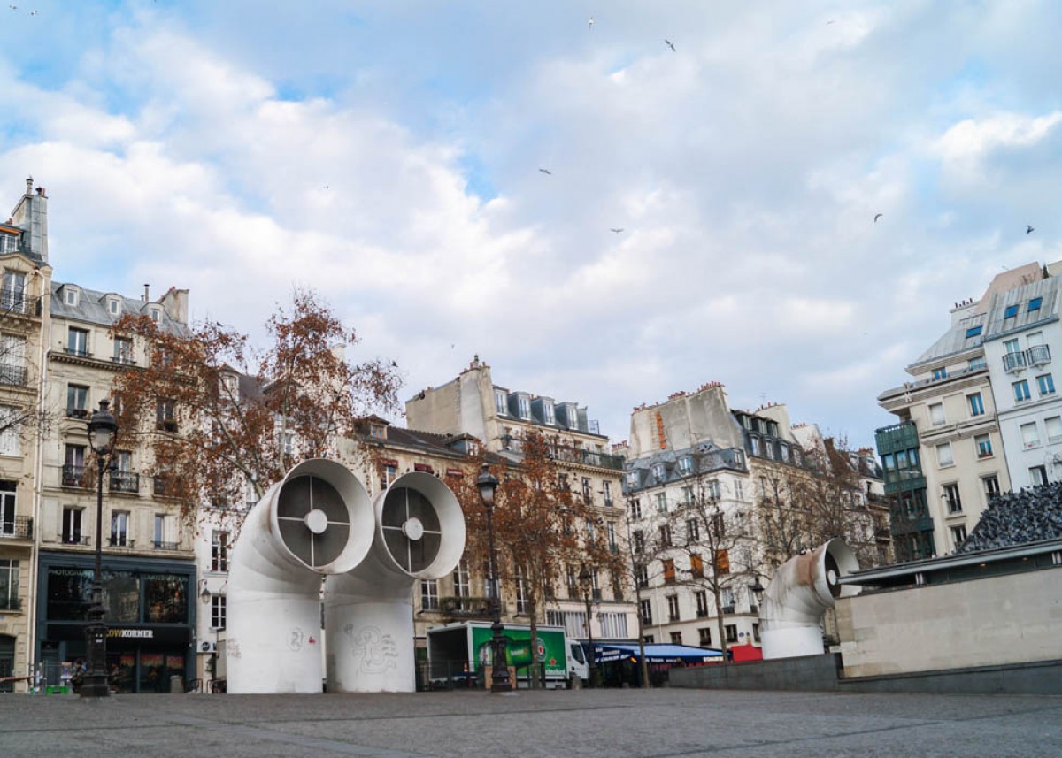 이 구조는 파리의 붐비는 지역에 위치하고 있으며, 뒤쪽에는 사람들이 모일 수 있는 넓은 공간을 남겨두었습니다.