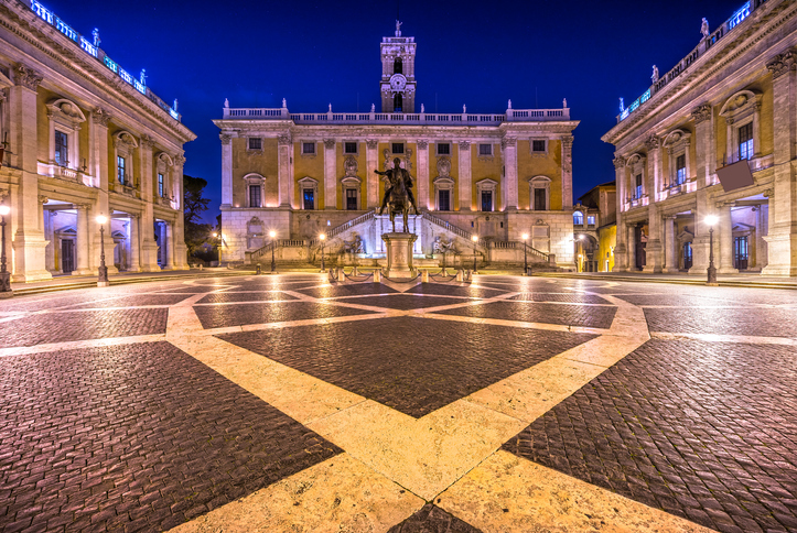 캄피돌리오 광장은 로마의 한 언덕 위에 위치한 광장으로, 미켈란젤로가 재설계한 공간입니다.