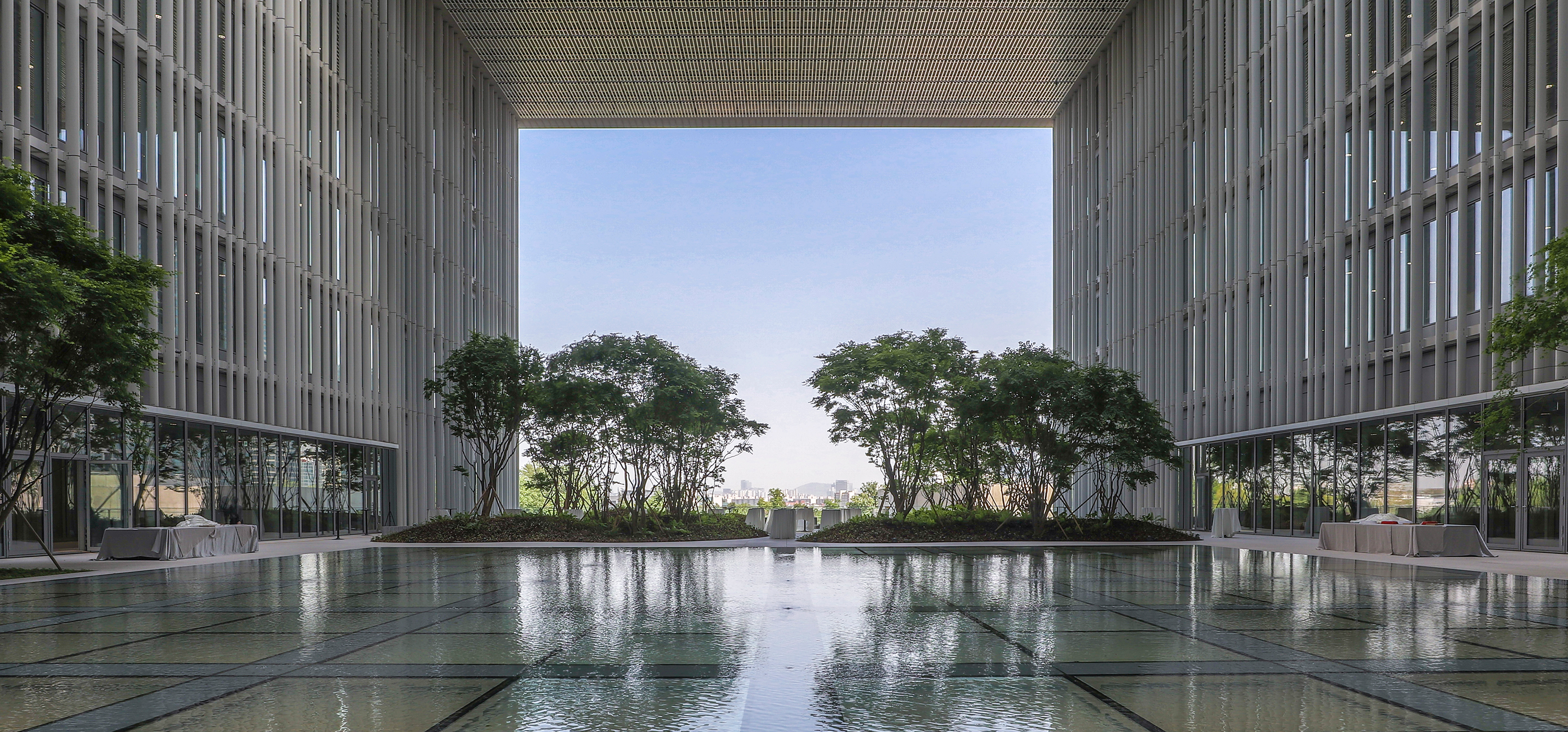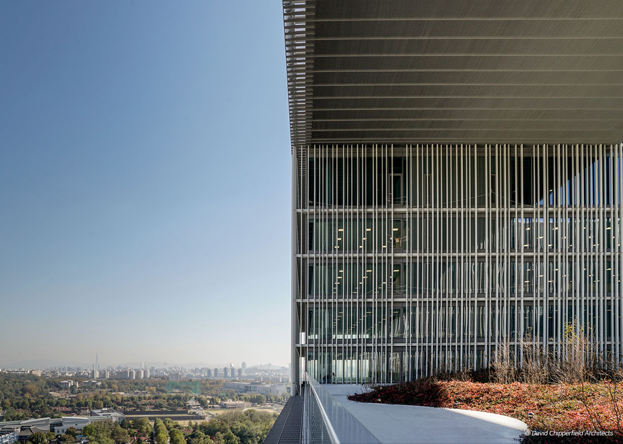 건물 전체에 설치된 루버는 무게감을 주며, 무광 마감된 알루미늄 루버들은 직사광선에 의한 눈부심을 막고 건물에 그늘을 드리워 열 하중을 낮춥니다.