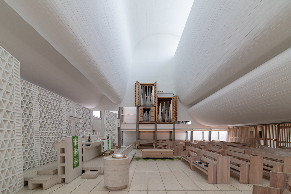 제단 벽은 삼각형 격자로 배치된 얇은 흰색 벽돌로 만들어졌으며, 교회의 오르간과 의자는 밝은 톤의 소나무로 제작됨.