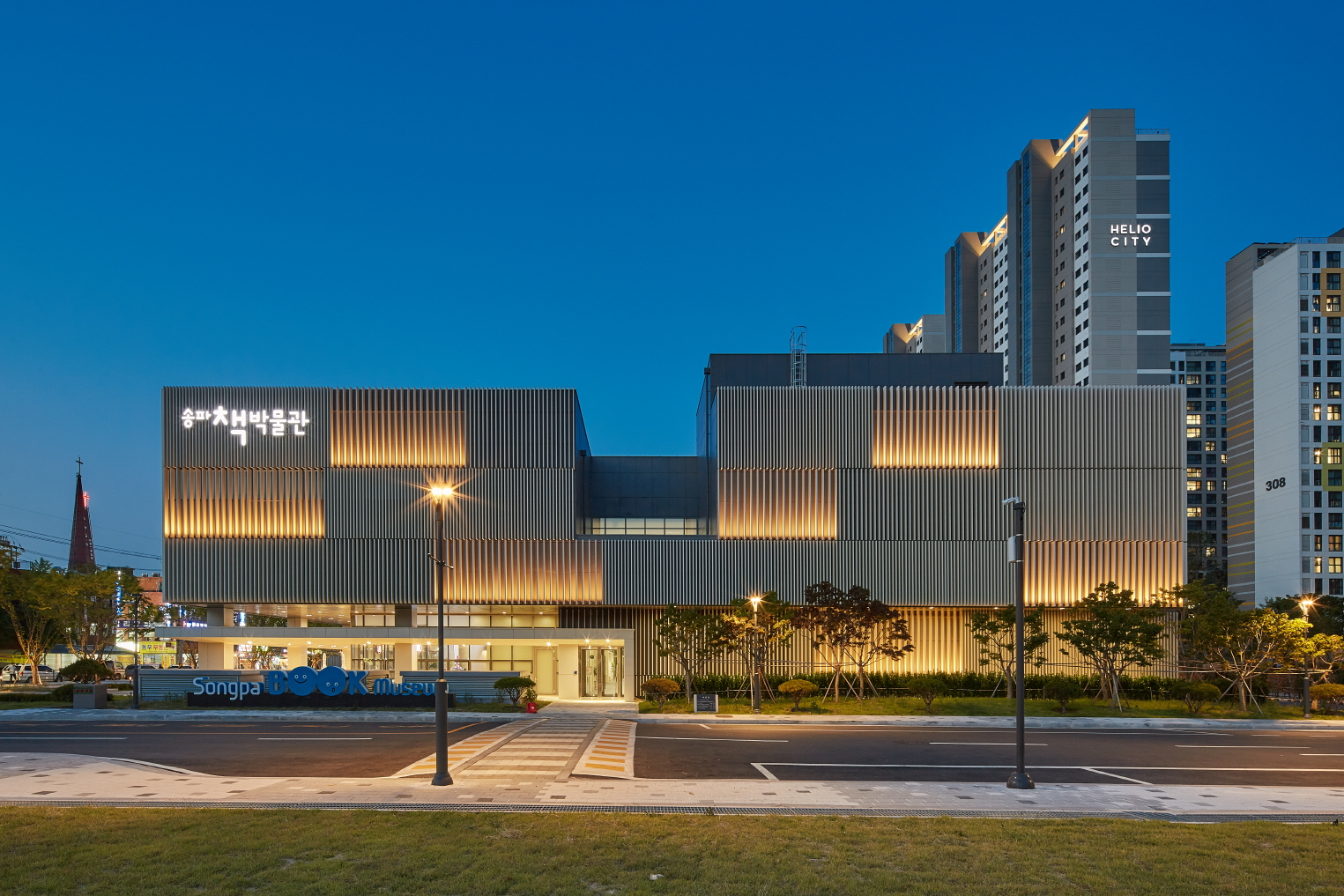 건물 외관은 책의 단면을 형상화한 디자인으로, 버티컬 루버가 시간과 위치에 따라 다양한 모습을 보여줍니다.