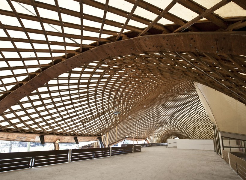 이 건축물은 서로 연결된 나무 껍질의 격자로 구성된 넓은 지붕을 특징으로 하며, 매혹적인 곡선의 웹을 형성합니다.