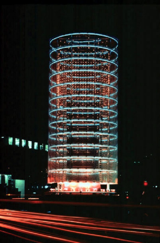 이 건물은 낮에는 도시의 모습을 연출하고, 밤에는 네온 고리와 조명을 통해 화려하고 역동적인 모습을 연출합니다.