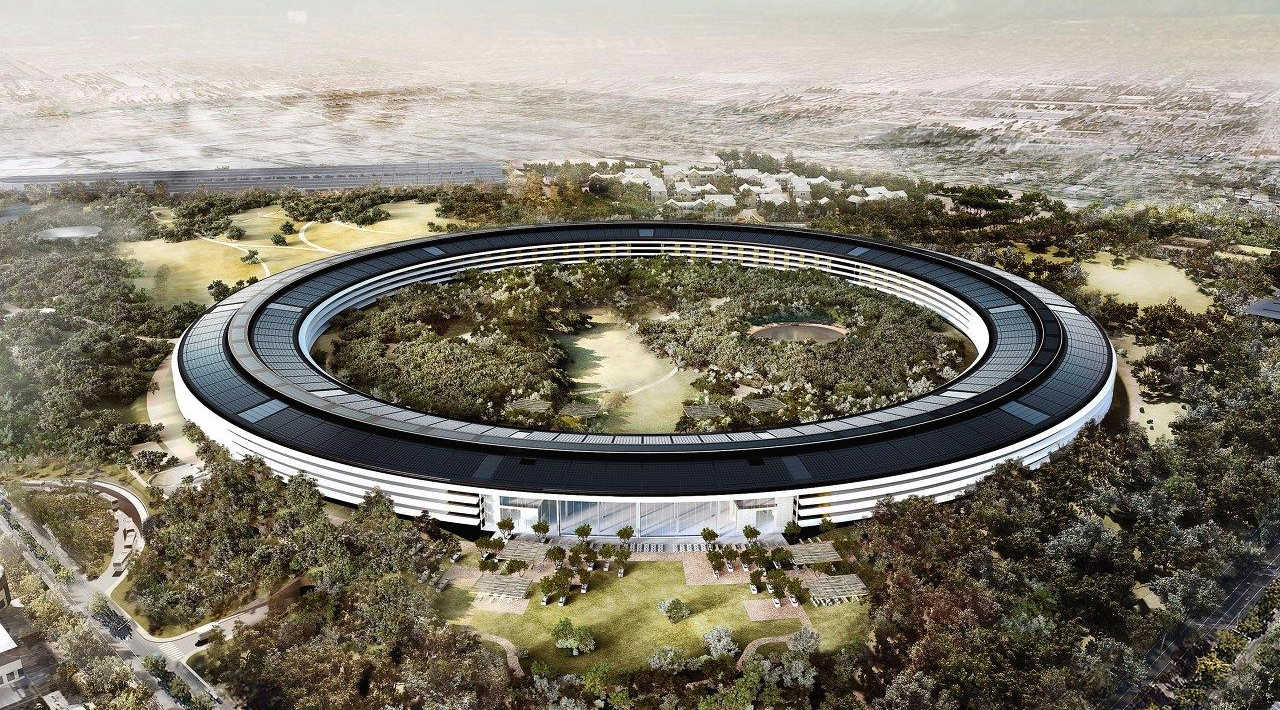 캘리포니아에 위치한 애플의 신사옥, 애플 파크는 원형의 친환경 건물로, 노먼 포스터가 스티브 잡스와 함께 계획하고 설계한 건축물입니다.