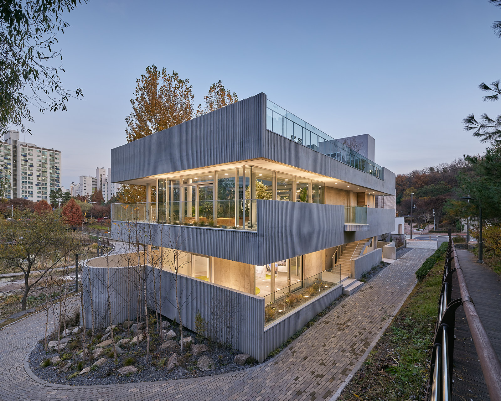 - 경계 흐트러뜨리기: 공원과 건물의 경계를 흐트러뜨리는 디자인으로, 공원의 경험이 건물 내부로 자연스럽게 이어지도록 동선을 배치했습니다.