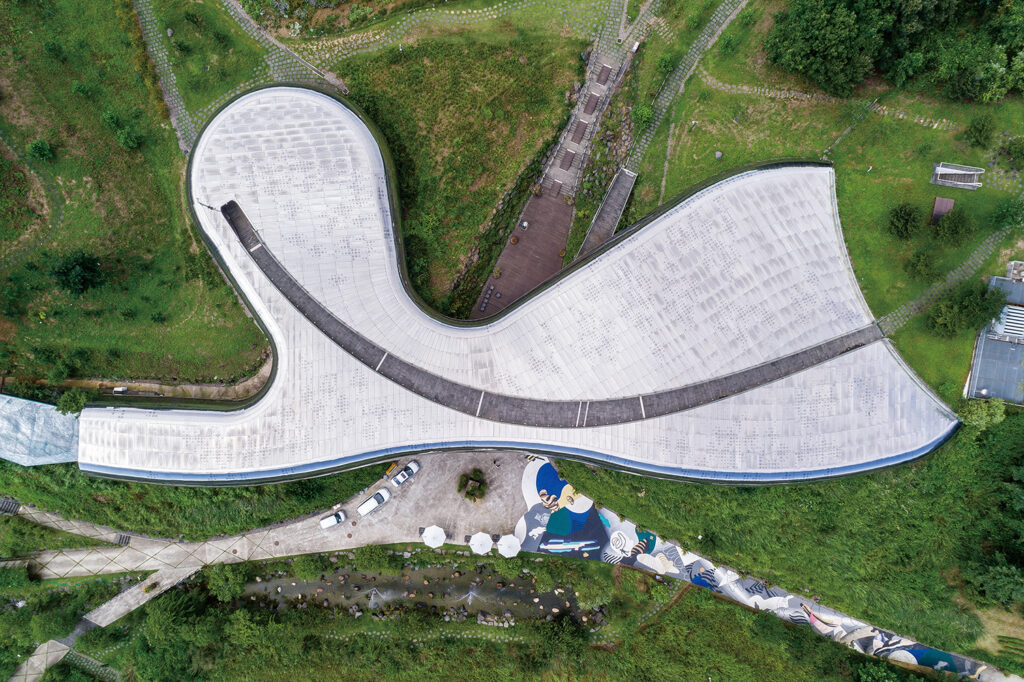 박물관은 두 개의 언덕을 유기적으로 연결하는 형태로 디자인되었으며, 외관은 스테인리스 스틸로 마감되어 낮에는 햇빛을 반사하여 빛나고, 보는 시점에 따라 파도처럼 일렁이는 독특한 모습을 자랑합니다.