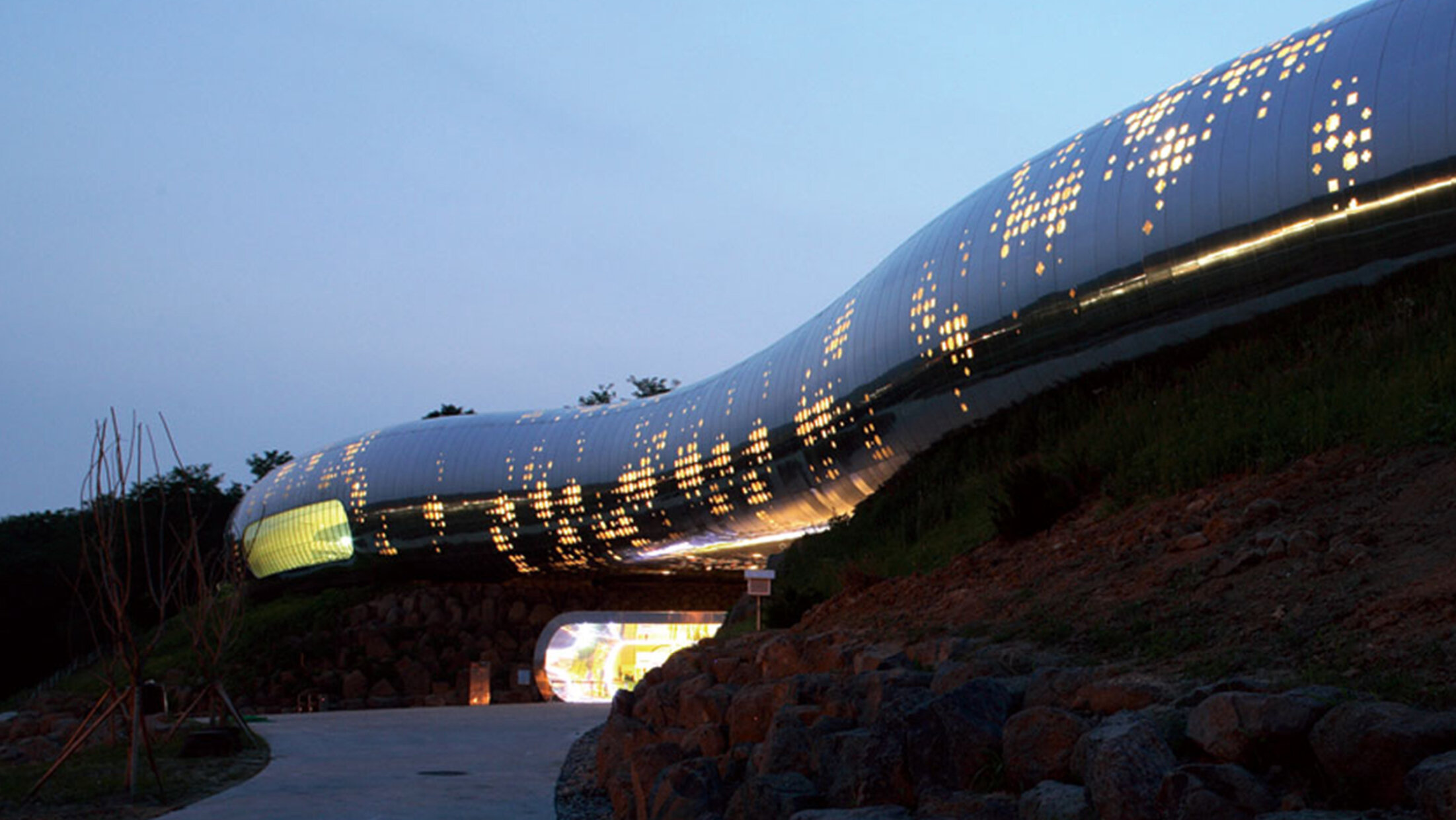 박물관은 두 개의 언덕을 유기적으로 연결하는 형태로 디자인되었으며, 외관은 스테인리스 스틸로 마감되어 낮에는 햇빛을 반사하여 빛나고, 보는 시점에 따라 파도처럼 일렁이는 독특한 모습을 자랑합니다.