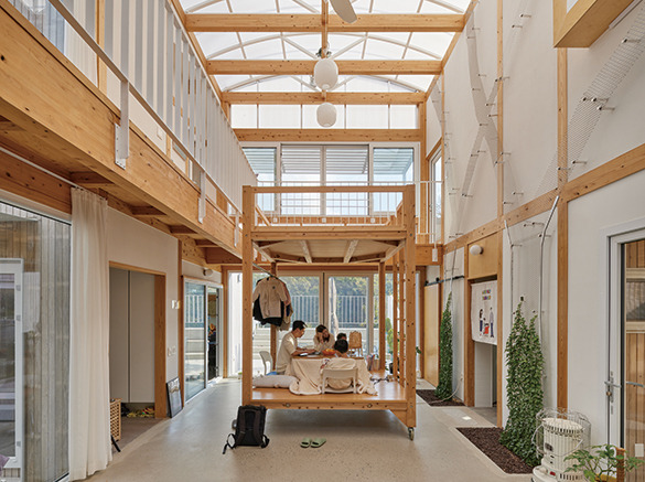 실내는 자연과의 연결을 강조하며, 따뜻하고 초대하는 분위기를 자아냅니다. 높은 나무 천장과 큰 창문이 특징이며, 최소한의 가구로 구성되어 있어 공간의 개방감을 더욱 부각시킵니다. 이러한 디자인은 부부가 서로 소통하고 협력할 수 있는 환경을 조성합니다.